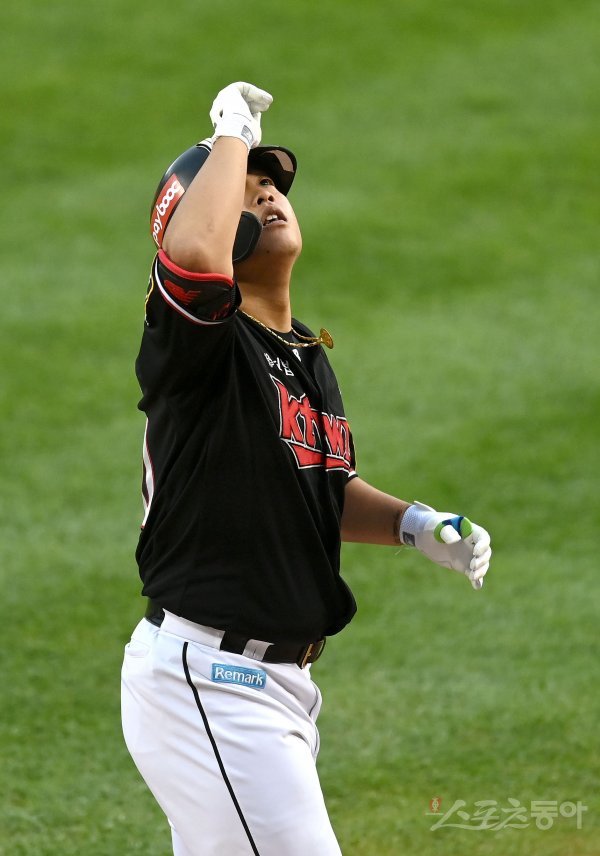 3회초 무사 1루 KT 강백호가 역전 투런 홈런을 날리고 그라운드를 돌며 세리머니를 하고 있다.
