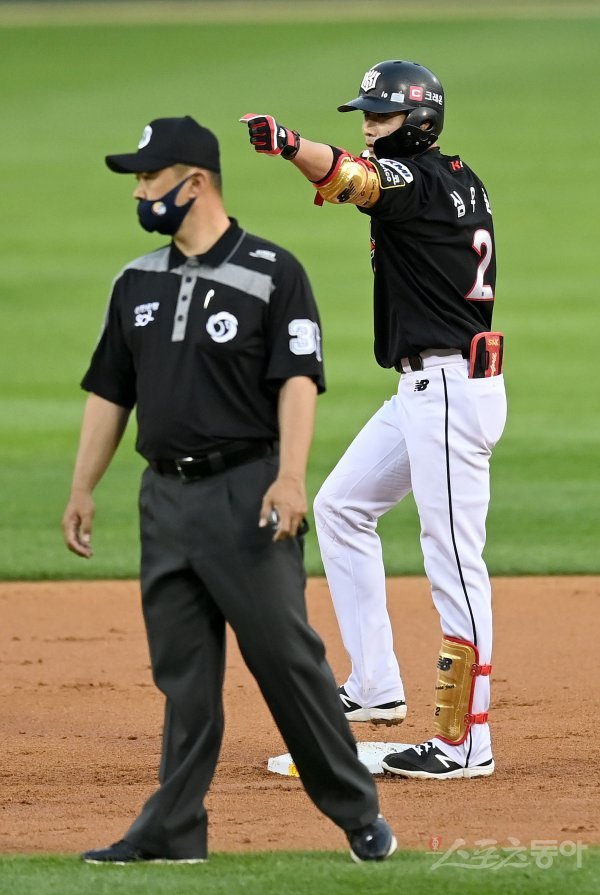 3회초 무사 2루 KT 심우준이 1타점 좌전 2루타를 치고 2루에서 기뻐하고 있다.