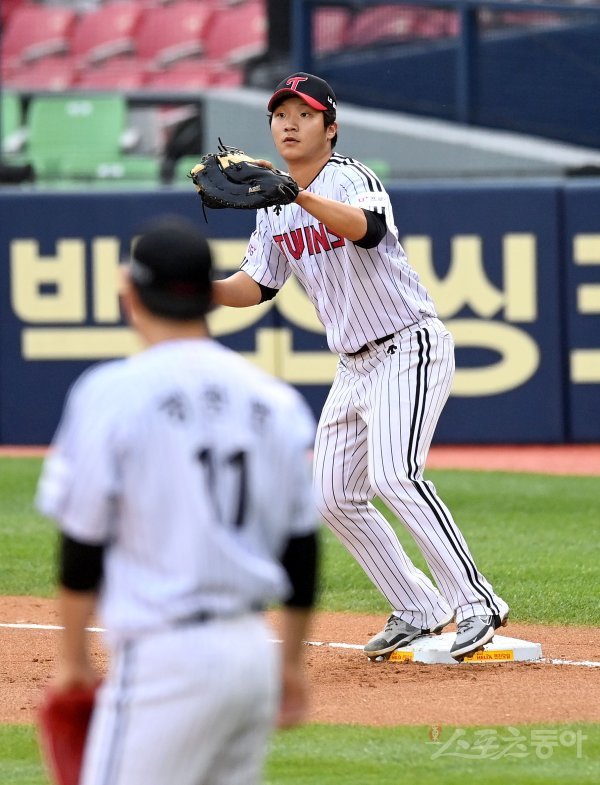 1루수로 선발 출장한 LG 문보경이 송구된 볼을 받고 있다.