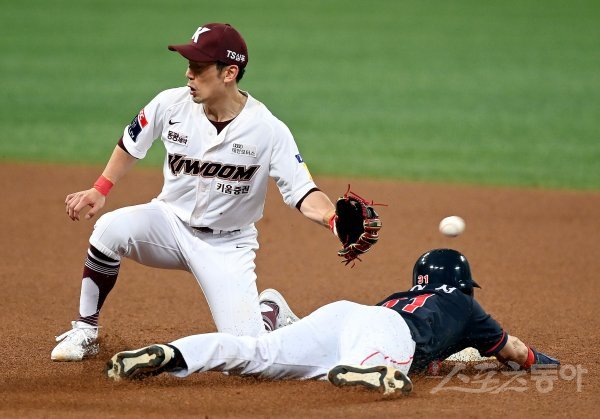 4회초 2사 1루에서 롯데 손아섭의 2루 도루 때 키움 서건창이 송구를 빠뜨리고 있다.