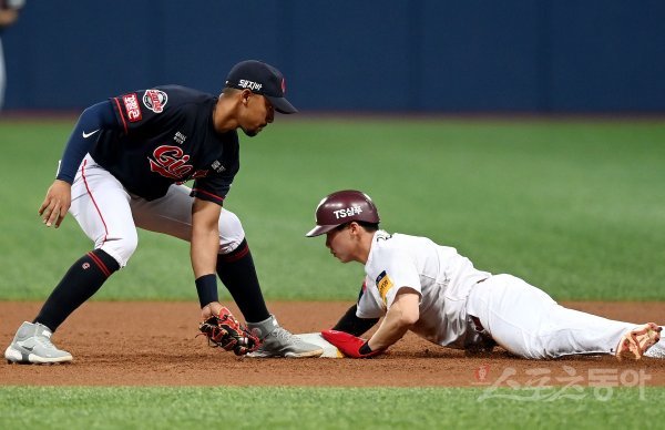 1회말 무사 1루에서 키움 김혜성이 2루 도루를 성공하고 있다.