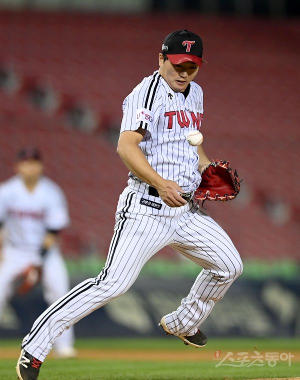 9회초 등판해 1이닝을 무실점으로 막으며 세이브를 따낸 LG 고우석이 9회초 2사 1루 KT 땅볼 타구를 잡고 있다.