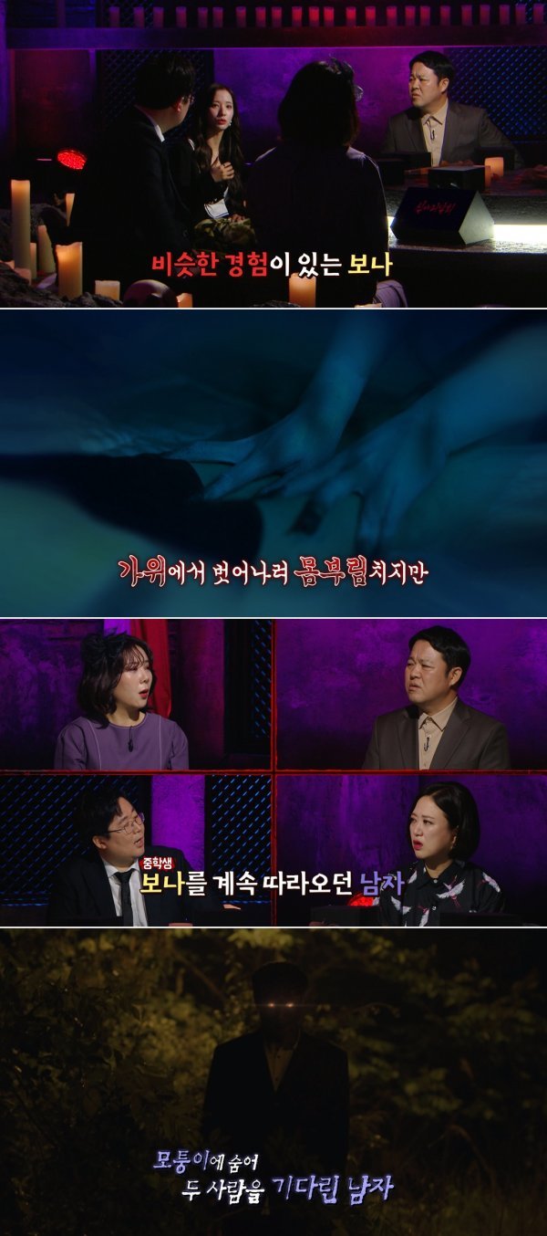 이날 보나는 본인이 직접 겪은 무서운 현실 괴담을 생생하게 이야기한다. 학창 시절, 하교하는 길에 보나를 뒤쫓아 온 한 남자가 있었다고. “마음에 들어서 그런데 번호 한 번만 줄 수 있느냐”며 끈질기게 매달렸다는 남자. 수상한 기운에 겁을 먹은 보나는 집까지 한달음에 달려갔다는데. 집 앞에 도착했을 때 보나는 그 남자가 끝까지 따라왔음을 깨닫는다. 현관문이 닫히기 직전의 순간, 문을 탁 잡은 남자가 음산하게 던진 말에 MC들은 경악을 금치 못했다는 후문.