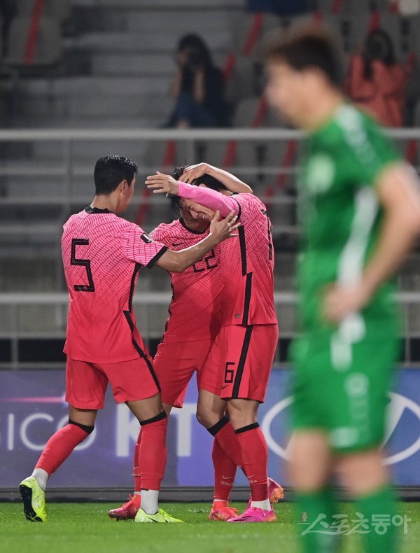5일 고양종합운동장에서 열린 하나은행 후원 ‘2022 카타르 월드컵’ 아시아 지역 2차 예선 투르크메니스탄과의 경기에서 황의조가 다섯 번째 골을 성공시킨 후 동료들과 기쁨을 나누고 있다.