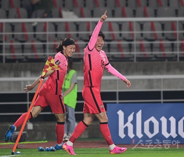 5일 고양종합운동장에서 열린 하나은행 후원 ‘2022 카타르 월드컵’ 아시아 지역 2차 예선 투르크메니스탄과의 경기에서 황의조가 전반전에 선제골을 성공시킨 후 세리머니를 하고 있다.