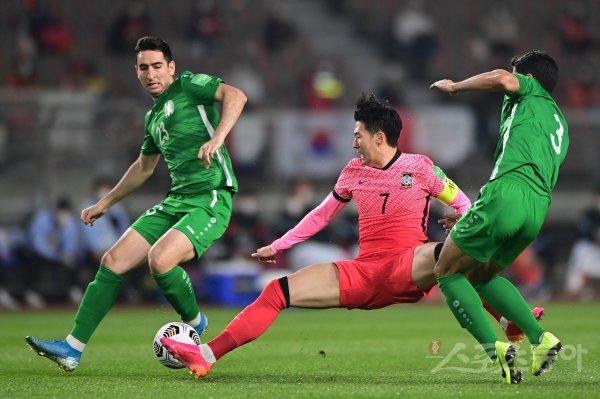 5일 고양종합운동장에서 열린 하나은행 후원 ‘2022 카타르 월드컵’ 아시아 지역 2차 예선 투르크메니스탄과의 경기에서 손흥민이 투르크메니스탄의 수비에 걸려 넘어지고 있다.