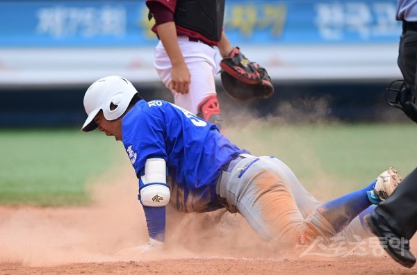 6일 서울 목동야구장에서 ‘제75회 황금사자기 전국고교야구대회 겸 주말리그 왕중왕전’ 32강 배명고와 청담고의 경기가 열렸다. 2회초 2사 2루 배명도 정승채가 3루타를 쳐낸 뒤 실책을 틈타 홈으로 파고들어 세이프 되고 있다.