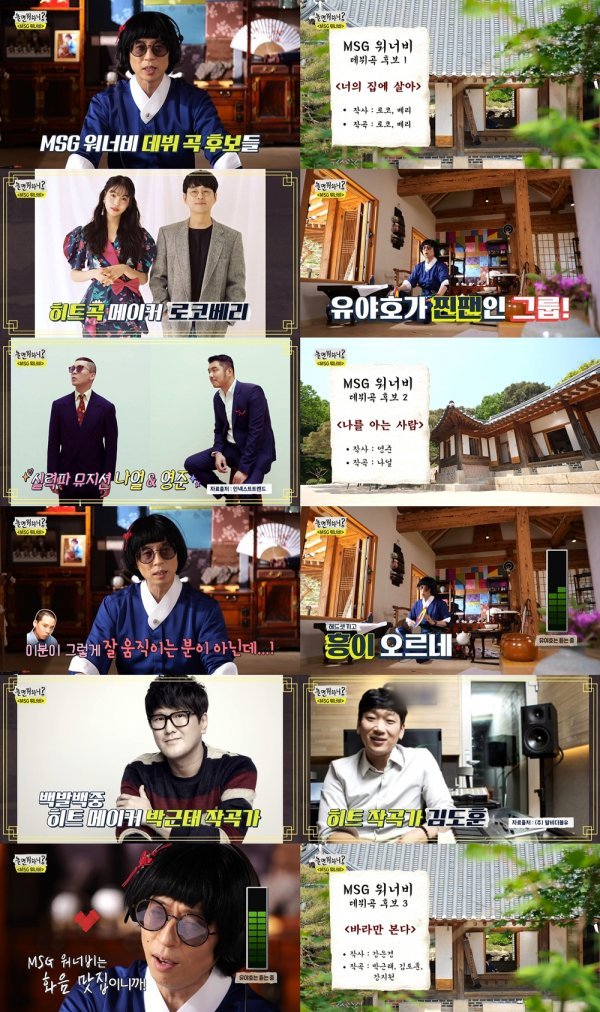 이날 방송에선 제작자 유야호(유재석)가 자신이 의뢰한 MSG워너비 데뷔 후보 곡들의 블라인드 청음 시간을 가지며 데뷔 행보에 박차를 가했다. 아련한 감성을 담은 로코베리의 ‘너의 집에 살아’에 이어 눈물샘을 자극하는 ‘브라운 아이드 소울’ 나얼&영준의 ‘나를 아는 사람’, 단번에 흥을 끌어올리며 SG워너비를 떠오르게 만드는 박근태&김도훈 작곡가의 ‘바라만 본다’까지. 유야호는 곡을 들을 때마다 즉흥적으로 멤버들의 파트를 구상하는 듯 곡에 흠뻑 빠져 감탄을 쏟아냈다.