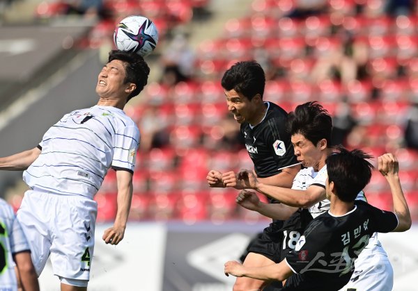 6일 경기도 탄천종합운동장에서 열린 ‘하나원큐 K리그1 2021’ 성남 FC와 전북 현대의 경기에서 전북 최영준이 헤딩을 하고 있다.