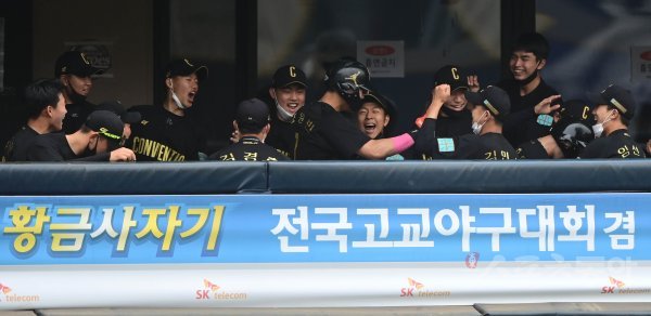 7일 서울 목동야구장에서 ‘제75회 황금사자기 전국고교야구대회 겸 주말리그 왕중왕전’ 32강 안산공고와 컨벤션고의 경기가 열렸다. 4회말 무사 만루 컨벤션고 신동준의 2타점 우전 적시타 때 득점에 성공한 3루주자 조원빈과 2루주자 김호영이 더그아웃에서 동료들의 축하를 받고 있다.
