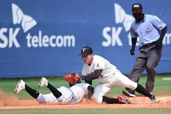 8일 서울 목동야구장에서 ‘제75회 황금사자기 전국고교야구대회 겸 주말리그 왕중왕전’ 16강 마산용마고와 유신고의 경기가 열렸다. 2회말 2사 1, 2루 유신고 조장현의 내야 안타 때 마산용마고 3루수 김세훈이 2루주자 유신고 김준상을 태그 아웃시키고 있다.