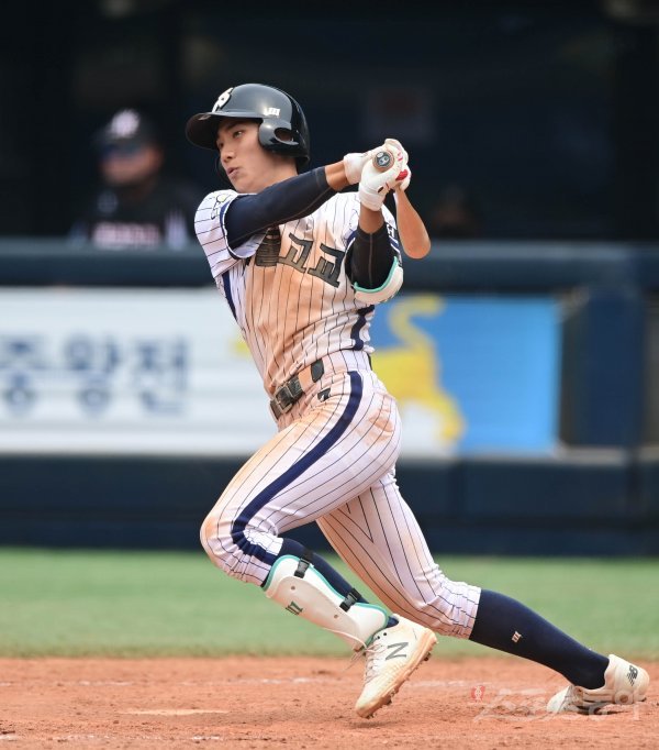 8일 서울 목동야구장에서 ‘제75회 황금사자기 전국고교야구대회 겸 주말리그 왕중왕전’ 16강 물금고와 서울고의 경기가 열렸다. 6회말 2사 3루 서울고 이재현이 1타점 좌전 적시타를 치고 있다.
