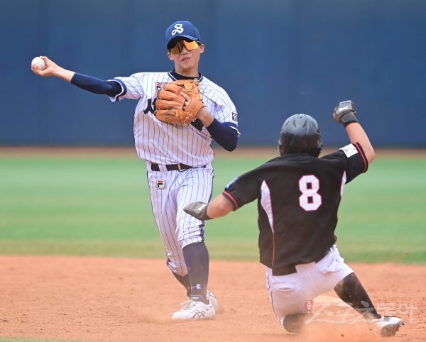 8일 서울 목동야구장에서 ‘제75회 황금사자기 전국고교야구대회 겸 주말리그 왕중왕전’ 16강 물금고와 서울고의 경기가 열렸다. 2회초 무사 1루 물금고 황민준의 내야 땅볼 때 서울고 2루수 이승한이 1루주자 김창린의 포스 아웃시킨 뒤 1루로 송구하고 있다.