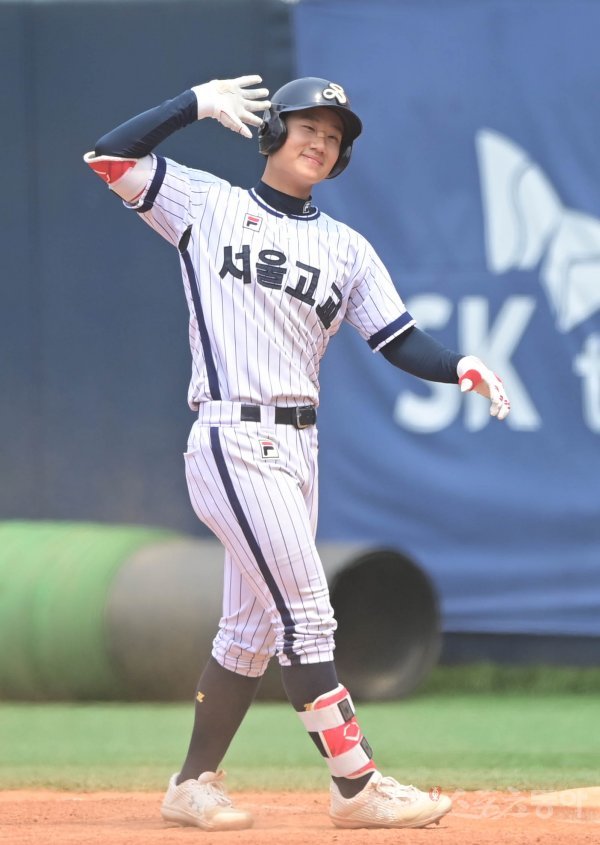 8일 서울 목동야구장에서 ‘제75회 황금사자기 전국고교야구대회 겸 주말리그 왕중왕전’ 16강 물금고와 서울고의 경기가 열렸다. 5회말 1사 2, 3루 서울고 김무성이 1타점 좌전 적시타를 쳐낸 뒤 세리머니를 하고 있다.