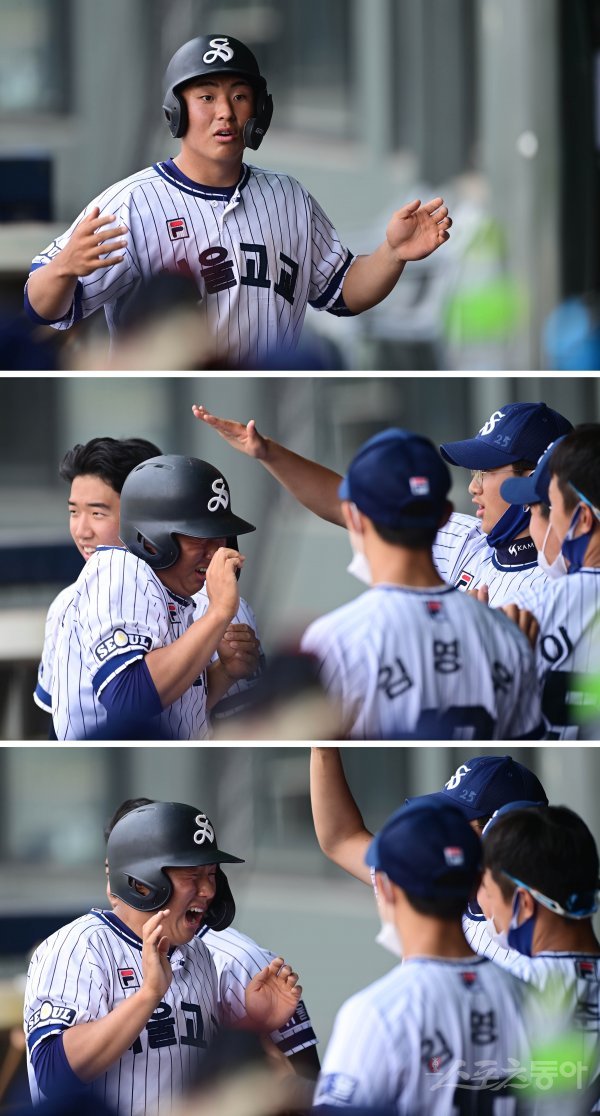 8일 서울 목동야구장에서 ‘제75회 황금사자기 전국고교야구대회 겸 주말리그 왕중왕전’ 16강 물금고와 서울고의 경기가 열렸다. 5회말 1사 1, 3루 서울고 박지민의 내야 땅볼 때 3루주자 김동빈이 득점에 성공한 후 더그아웃에서 동료들의 축하를 받고 있다.