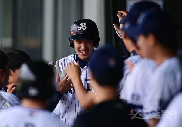 8일 서울 목동야구장에서 ‘제75회 황금사자기 전국고교야구대회 겸 주말리그 왕중왕전’ 16강 물금고와 서울고의 경기가 열렸다. 7회말 1사 3루 서울고 정민준의 적시타 때 3루주자 이준서가 득점에 성공한 후 더그아웃에서 동료들의 축하를 받고 있다.