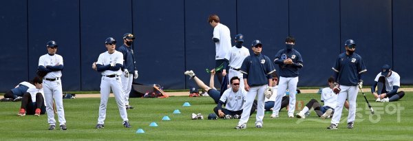 NC 코치들이 외야로 날아오는 공을 잡으려 준비하고 있다.