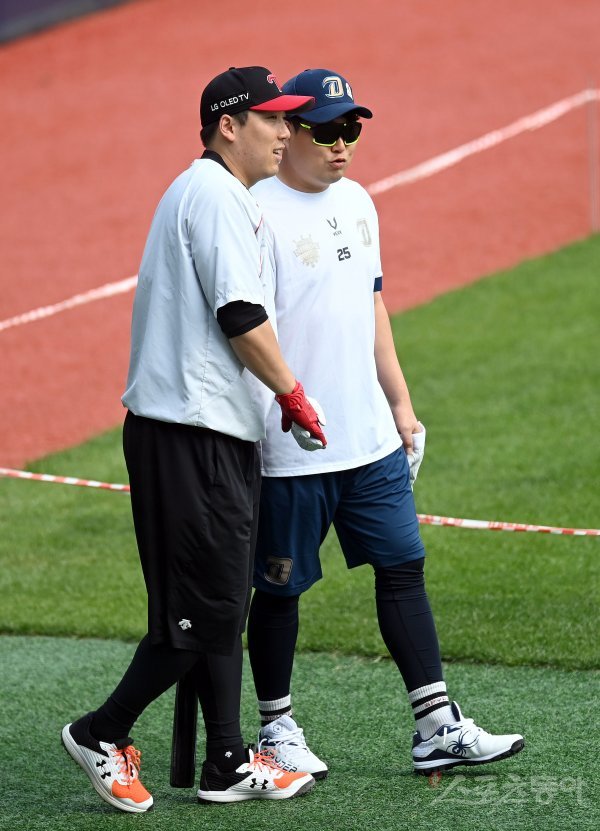 NC 양의지와 LG 김현수가 이야기를 나누고 있다.