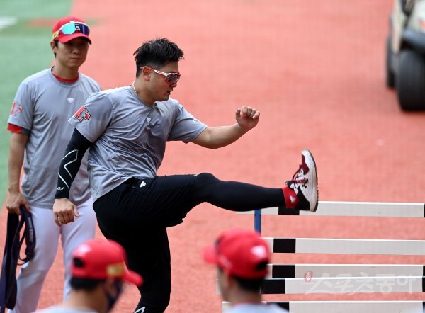 경기 전 SSG 최주환이 훈련을 하고 있다.