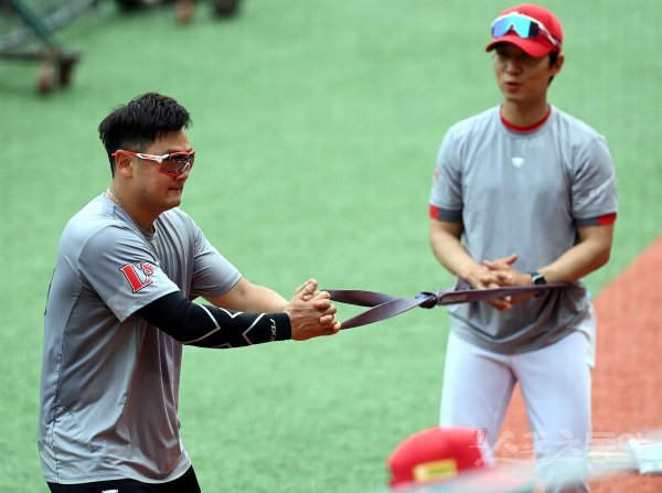 경기 전 SSG 최주환이 훈련을 하고 있다.