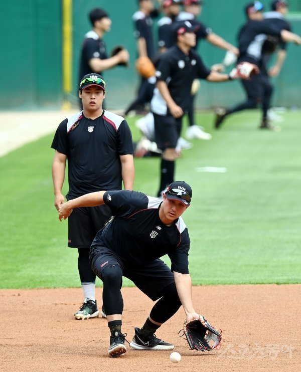 경기 전 kt 황재균이 3루 수비 훈련을 하고 있다.
