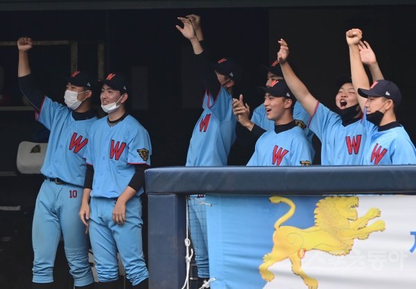 4회말 수비를 마친 뒤 휘문고 선수들이 더그아웃에서 기뻐하고 있다.