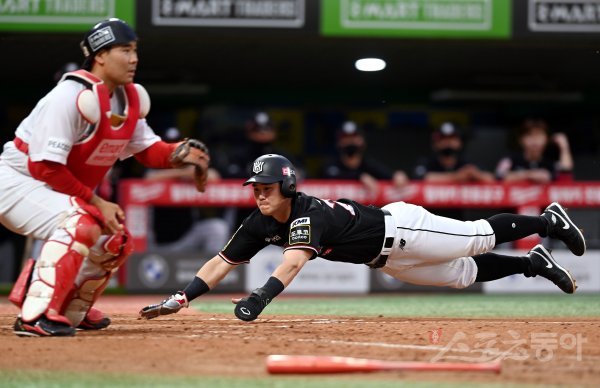 4회초 무사 만루에서 kt 3루 주자 배정대가 희생플라이 때 홈 득점에 성공하고 있다.