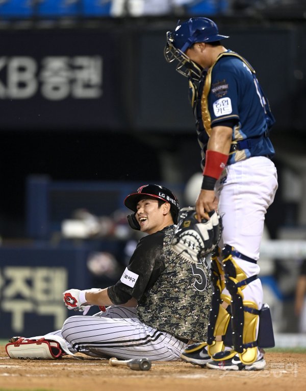 5회말 1사 LG 홍창기가 사구를 맞고 그라운드에 앉아 웃고 있다.