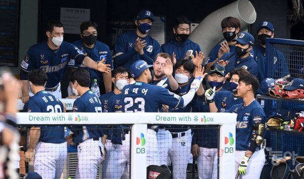 2회초 무사 NC 알테어가 선제 우월 솔로 홈런을 날리고 그라운드를 돌아 홈인해 동료들의 축하를 받고 있다.