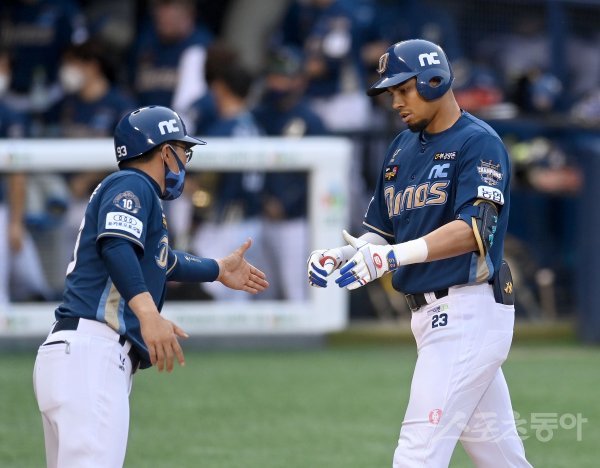 2회초 무사 NC 알테어가 선제 우월 솔로 홈런을 날리고 그라운드를 돌아 홈인해 하이파이브 하고 있다.