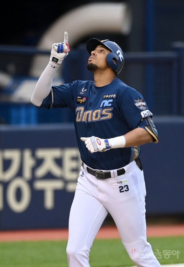 2회초 무사 NC 알테어가 선제 우월 솔로 홈런을 날리고 그라운드를 돌며 세리머니를 하고 있다.