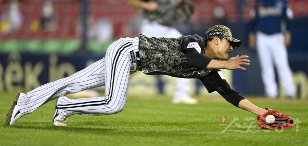 7회초 무사 LG 이정용이 번트 타구를 잡기위해 슬라이딩 했으나 놓치고 있다.