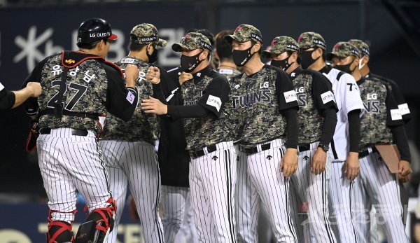 2-1 역전승을 거둔 LG 선수들이 류지현 감독과 하이파이브 하고 있다.