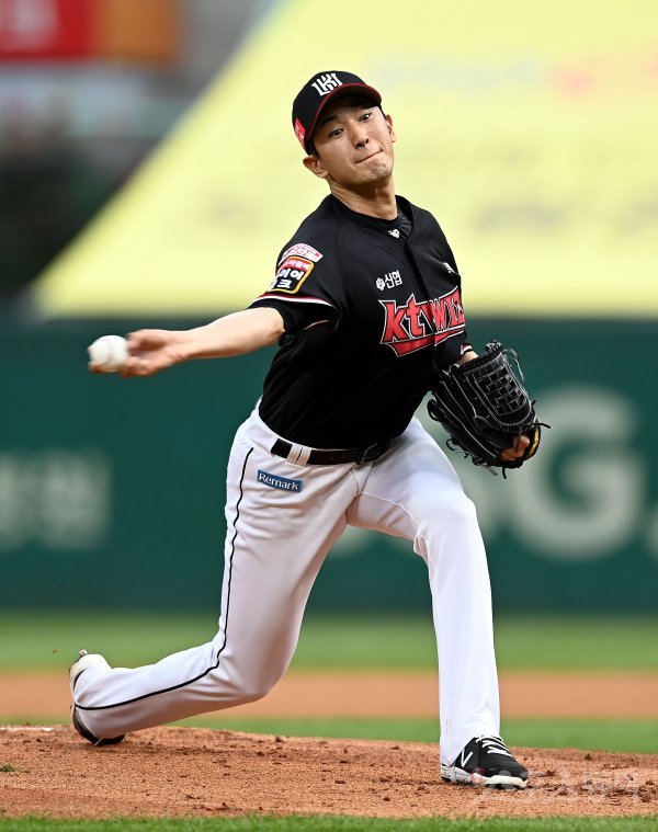 8일 인천 SSG 랜더스필드에서 ‘2021 신한은행 SOL KBO리그’ SSG 랜더스와 kt 위즈의 경기가 열렸다. kt 선발투수 고영표가 힘차게 볼을 던지고 있다. 인천 | 김민성 기자 marineboy@donga.com