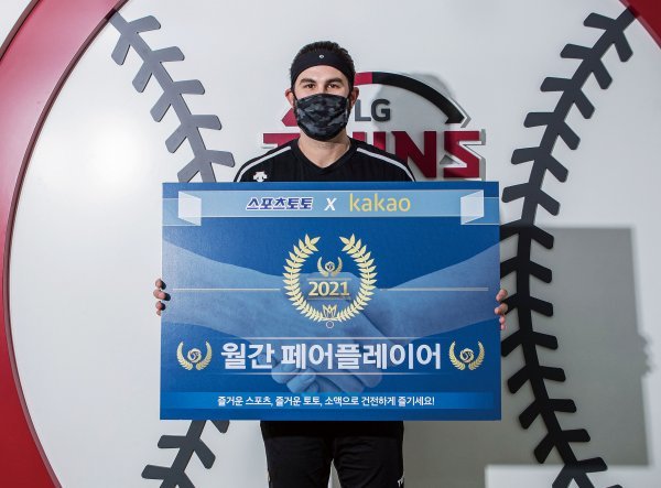 ‘2021 KBO리그 월간 페어플레이어’ 4월 수상자로 선정된 LG 케이시 켈리. 사진제공 | 스포츠토토