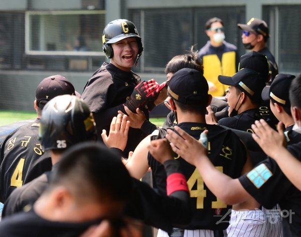 9일 서울 목동야구장에서 ‘제75회 황금사자기 전국고교야구대회 겸 주말리그 왕중왕전’ 16강 충암고와 컨벤션고의 경기가 열렸다. 4회말 1사 만루, 컨벤션고 6번 오정우의 내야 땅볼 때 충암고 2루수 송승엽의 실책을 틈타 3루주자 신동준이 득점에 성공한 뒤 더그아웃에서 동료들과 기쁨을 나누고 있다.