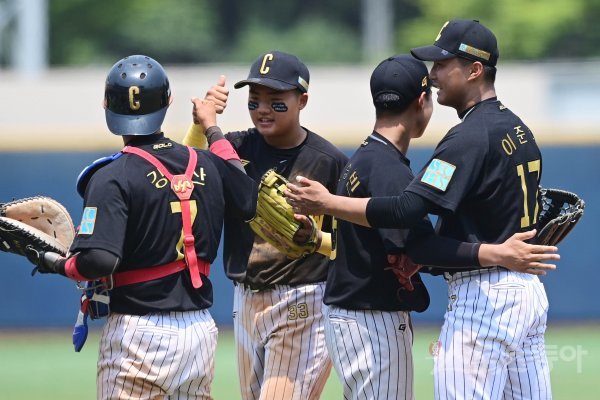 9일 서울 목동야구장에서 ‘제75회 황금사자기 전국고교야구대회 겸 주말리그 왕중왕전’ 16강 충암고와 컨벤션고의 경기가 열렸다. 컨벤션고가 충암고에 12-3으로 7회초 콜드승을 거둔 뒤 선수들이 기쁨을 나누고 있다.