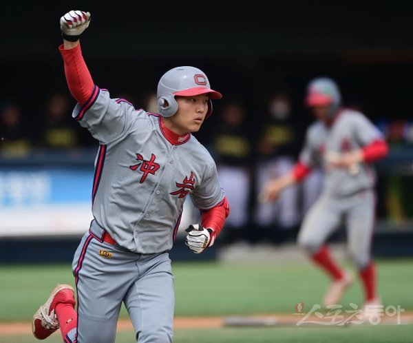 9일 서울 목동야구장에서 ‘제75회 황금사자기 전국고교야구대회 겸 주말리그 왕중왕전’ 16강 충암고와 컨벤션고의 경기가 열렸다. 3회말 1사 만루, 충암고 4번 백승민이 역전 2타점 우전 적시타를 쳐낸 뒤 기뻐하고 있다.