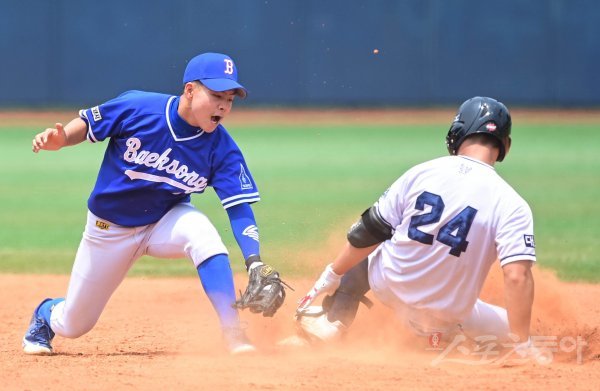 9일 서울 목동야구장에서 ‘제75회 황금사자기 전국고교야구대회 겸 주말리그 왕중왕전’ 16강 백송고와 대구고의 경기가 열렸다. 1회말 1사 2루, 대구고 3번 두정민의 선제 1타점 좌전 안타로 2루에서 세입되고 있다. 백송고 2루수는 장민혁.