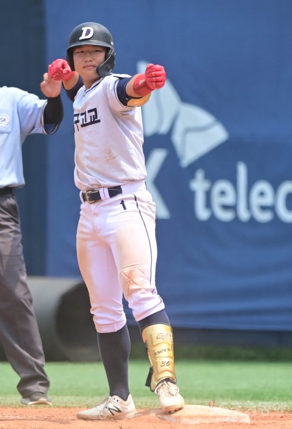 9일 서울 목동야구장에서 ‘제75회 황금사자기 전국고교야구대회 겸 주말리그 왕중왕전’ 16강 백송고와 대구고의 경기가 열렸다. 2회말 1사 2루, 대구고 1번 이재용이 1타점 우전 적시타를 쳐낸 뒤 1루에서 세리머니를 하고 있다.