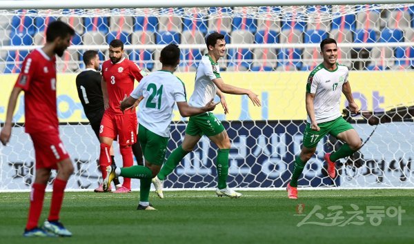9일 경기도 고양 종합운동장에서 열린 ‘2022 카타르월드컵’ 아시아지역 2차예선 조별리그 레바논과 투르크메니스탄의 경기에서 투르크메니스탄 알티무라트 안나두르디예프(17)가 역전골을 넣은 뒤 환호하고 있다.