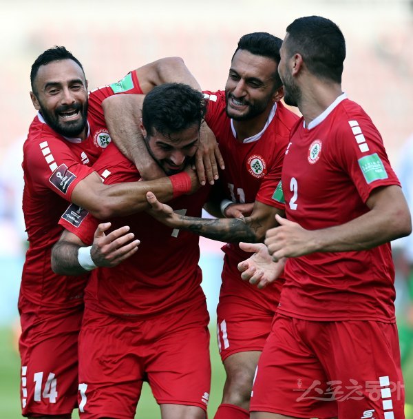 9일 경기도 고양 종합운동장에서 열린 ‘2022 카타르월드컵’ 아시아지역 2차예선 조별리그 레바논과 투르크메니스탄의 경기에서 레바논 HASSAN SAAD(7)가 역전골을 넣은 뒤 동료들과 기쁨을 나누고 있다.