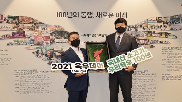 박대안 육우자조금관리위원회 위원장은 “2014년 육우자조금 설립 이후 육우에 관심이 생기고 산업을 성장시킬 수 있었다”며 “7년 만에 육우산업이 크게 성장한 것은 육우산업에 종사하는 모든 분들 덕분이다. 육우데이를 빌어 감사의 말을 전한다”고 했다. 박대안 위원장(왼쪽)과 육우 홍보대사로 위촉된 양준혁 야구해설위원이 등심과 갈비살 등 한반도 모양의 100% 국내산 육우를 소개하고 있다.
