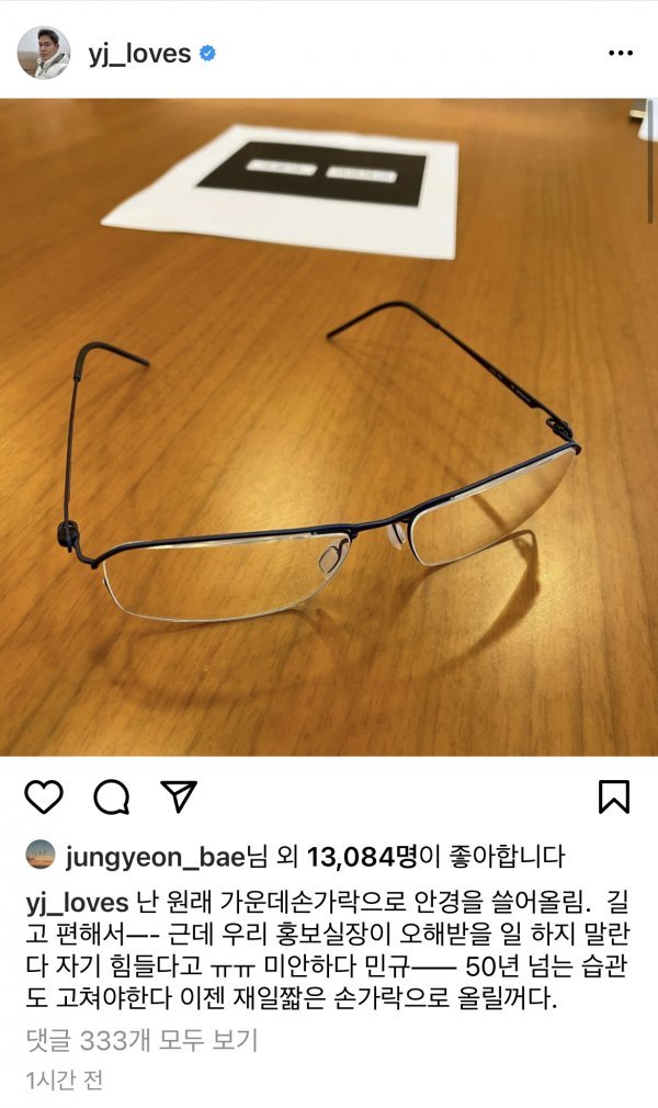 정 부회장은 8일 자신의 인스타그램에 안경 사진과 함께 “난 원래 가운데 손가락으로 안경을 쓸어 올림. 길고 편해서. 근데 우리 홍보실장이 오해받을 일 하지 말란다 자기 힘들다고. ㅠㅠ 미안하다 민규. 50년 넘는 습관도 고쳐야 한다. 이젠 제일 짧은 손가락으로 올릴꺼다”라고 썼다. 여기서 민규는 김민규 신세계그룹 홍보실장을 지칭한다.