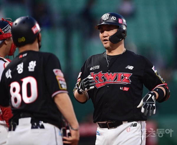 4회초 무사 1루 KT 장성우가 좌월 투런 홈런을 쳐낸 뒤 1루코치와 기쁨을 나누고 있다.