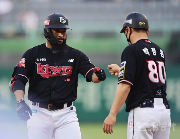 1회초 2사 3루 KT 알몬테가 선제 1타점 우전 적시타를 쳐낸 뒤 1루코치와 기쁨을 나누고 있다.