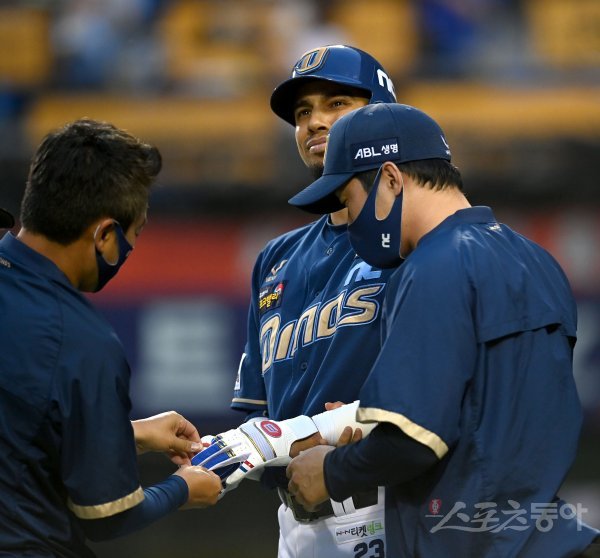 3회초 2사 만루 NC 알테어가 타격 과정에서 볼에 맞자 관계자들이 상태를 살펴보고 있다.