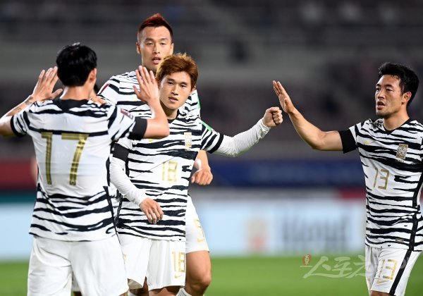 9일 경기도 고양 종합운동장에서 열린 ‘2022 카타르월드컵’ 아시아지역 2차예선 조별리그 한국과 스리랑카의 경기에서 한국 이동경이 골을 넣은 뒤 동료들과 기쁨을 나누고 있다.
