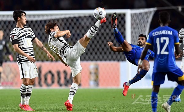 9일 경기도 고양 종합운동장에서 열린 ‘2022 카타르월드컵’ 아시아지역 2차예선 조별리그 한국과 스리랑카의 경기에서 한국 손준호가 스리랑카 선수와 볼 다툼을 벌이고 있다.
