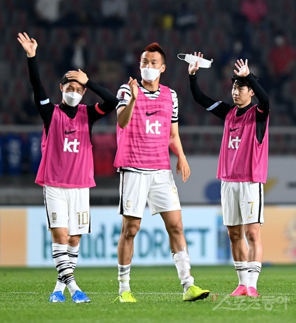 9일 경기도 고양 종합운동장에서 열린 ‘2022 카타르월드컵’ 아시아지역 2차예선 조별리그 한국과 스리랑카의 경기에서 한국이 스리랑카에 5-0으로 승리한 뒤 벤치에서 자리를 지킨 손흥민이 동료들과 함께 팬들에게 인사하고 있다.